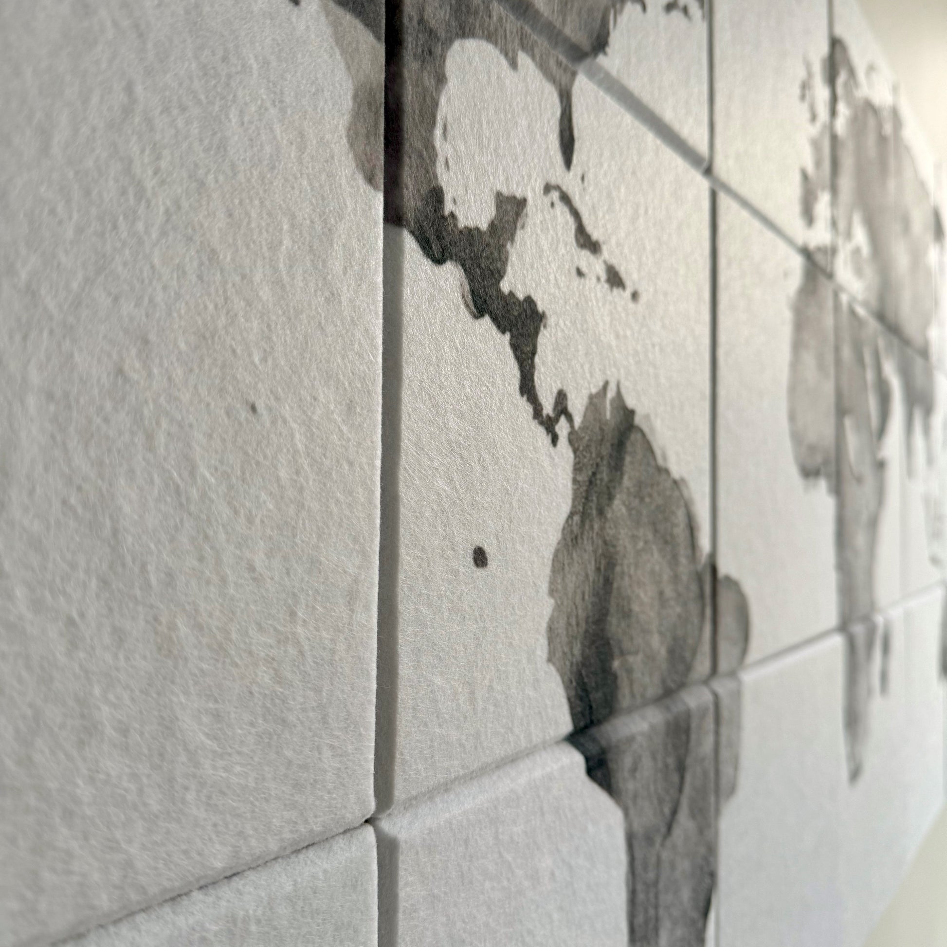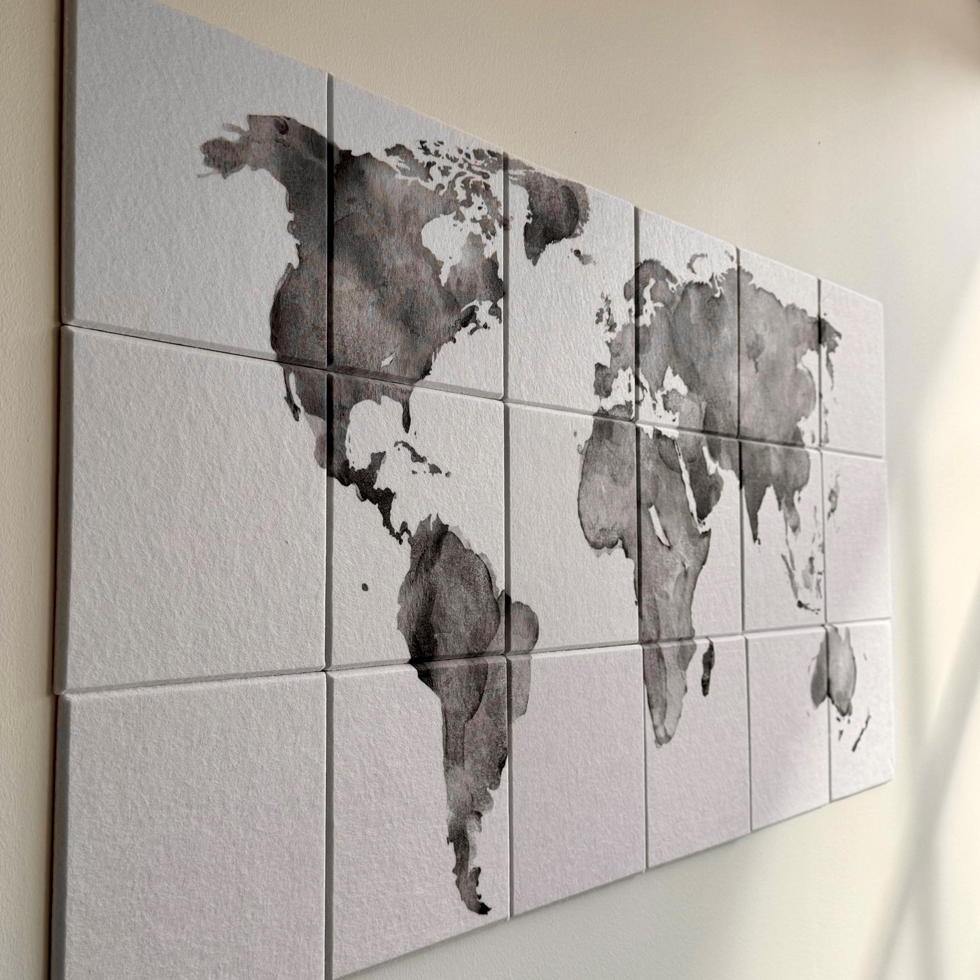 Våre akustikkplater med verdenskart er mer enn bare støydempende elementer – de er kunstverk i seg selv. Med sitt elegante, verdensomspennende design og myke vannfargeeffekt passer de perfekt inn i både stue, kontor og soverom. Skap en rolig og stilig atmosfære der du får både estetikk og forbedret akustikk.
