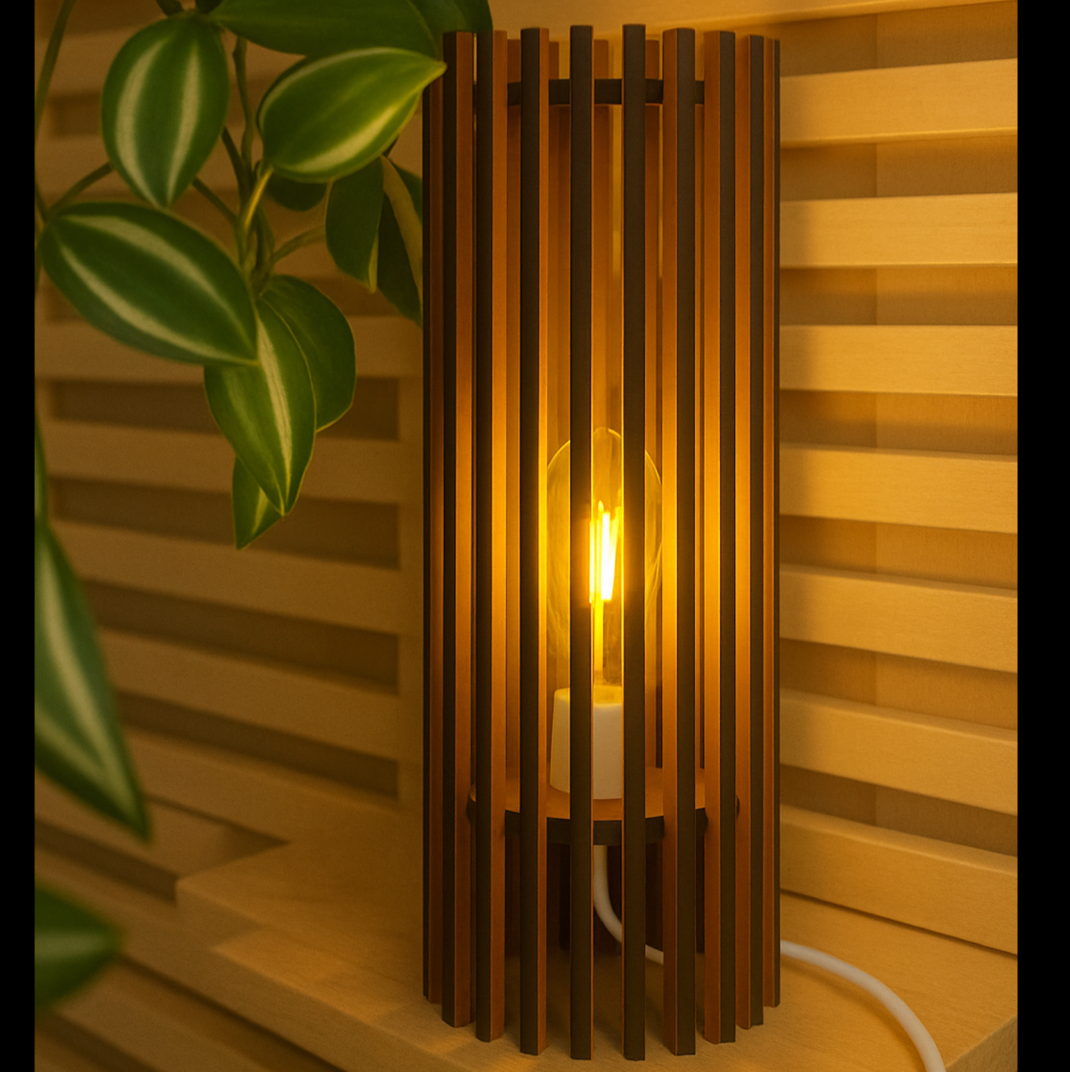 Den unike lampeskjermen består av vertikale eikelister som elegant omslutter lyskilden og skaper et stemningsfullt spill av lys og skygger i rommet.