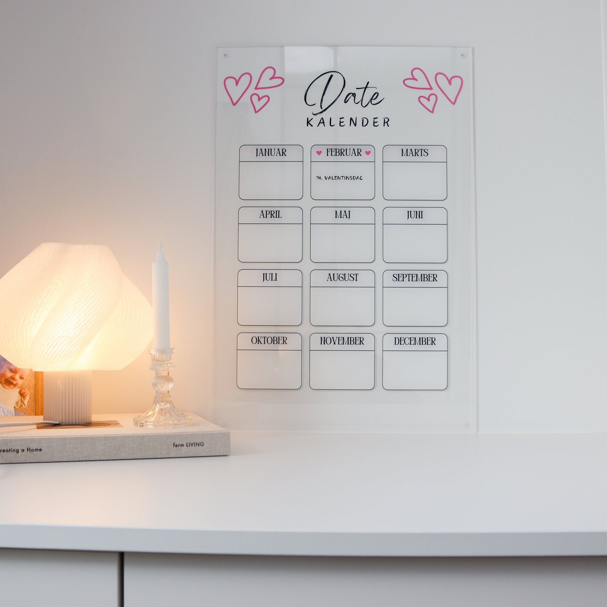 Livet kan være travelt, men kjærligheten fortjener sin plass. Med vår date-kalender i akryl kan dere planlegge og organisere kvalitetstid sammen på en morsom og personlig måte. Hver måned har sitt eget område hvor dere kan skrive inn planlagte dater, små overraskelser og hyggelige stunder – og skape minner som varer.