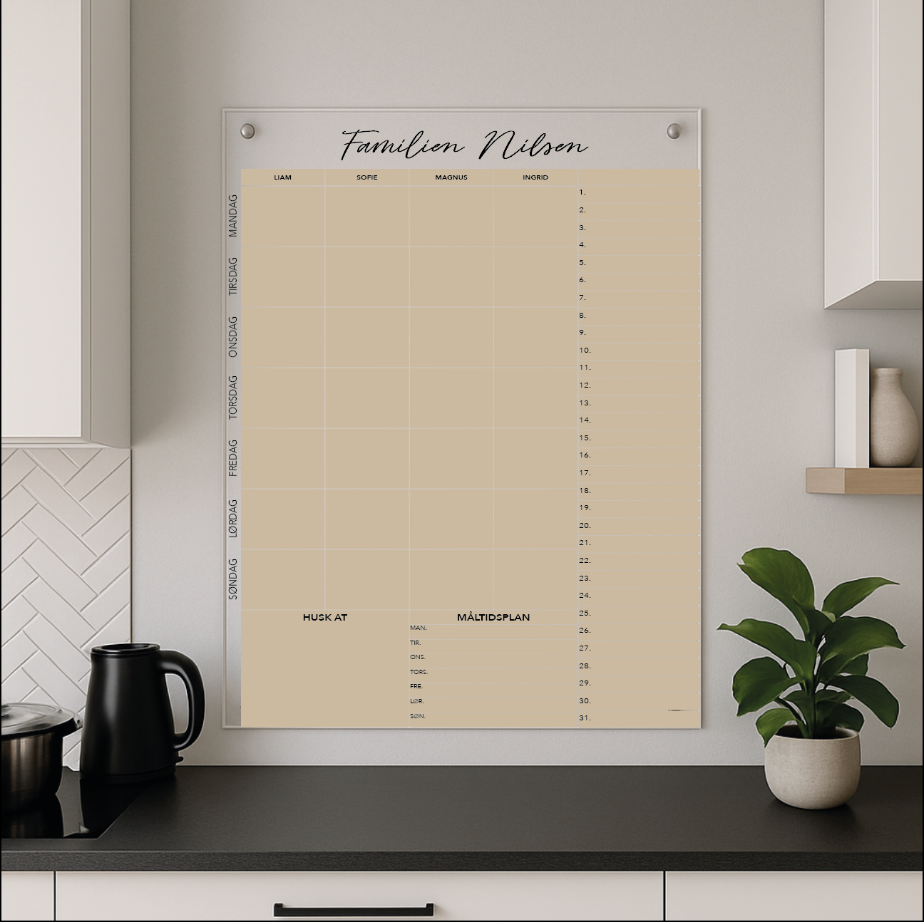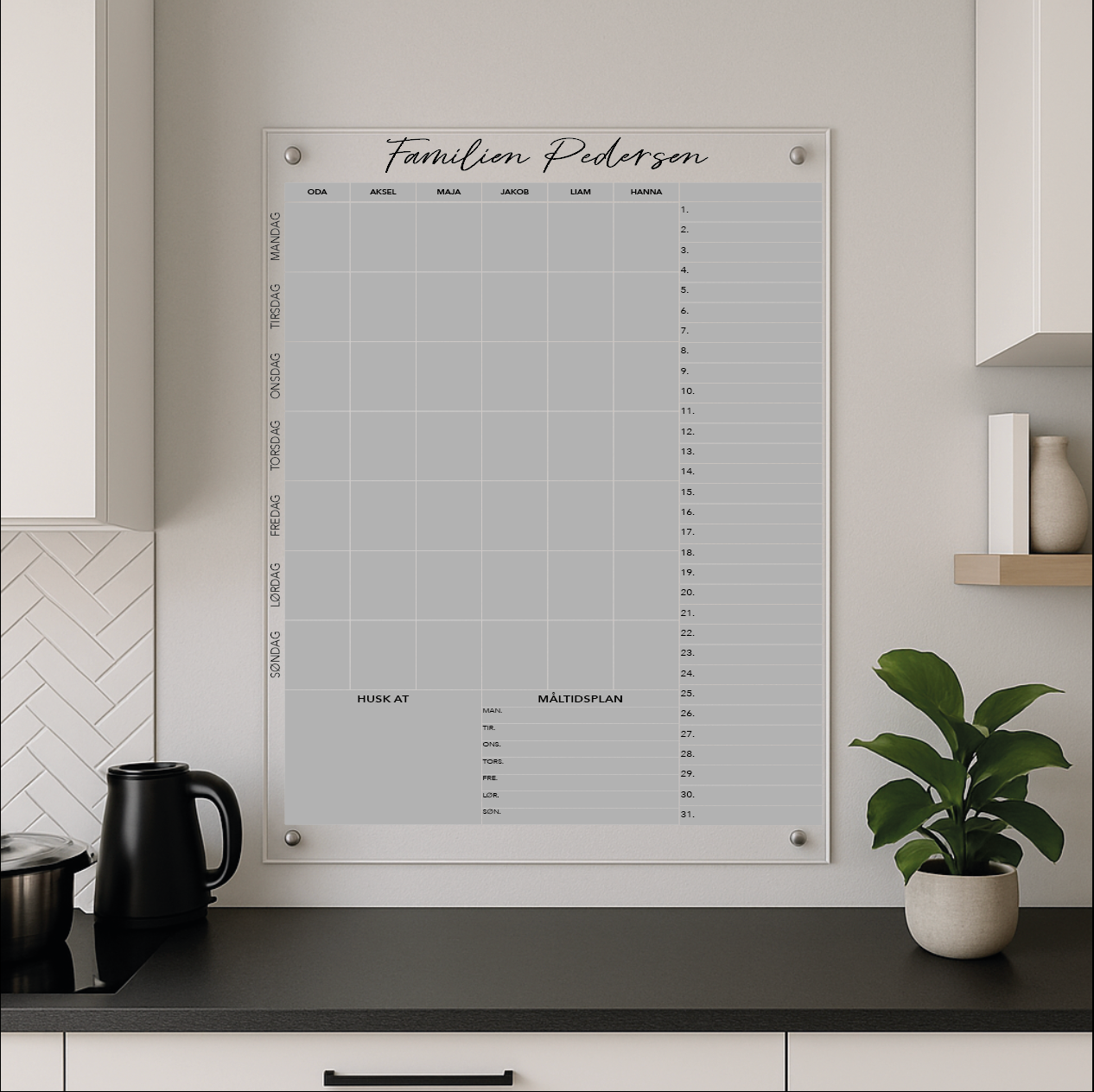 Ønsker du å legge til et personlig preg på familiens planlegging – samtidig som du får en flott veggdekorasjon? Vår personlige familiekalender på plexiglass er den ultimate løsningen. Denne kalenderen er mer enn bare en oversikt over dagene – den er skreddersydd for din families behov og stil.