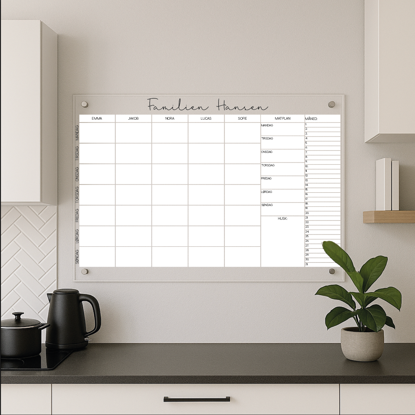 Ønsker du å legge til en personlig touch i familiens planlegging samtidig som du får en vakker veggdekorasjon? Vår personlige familiekalender i plexiglass er den ultimate løsningen. Denne kalenderen er mer enn bare en tidsplan – den er skreddersydd for din families unike behov og stil.