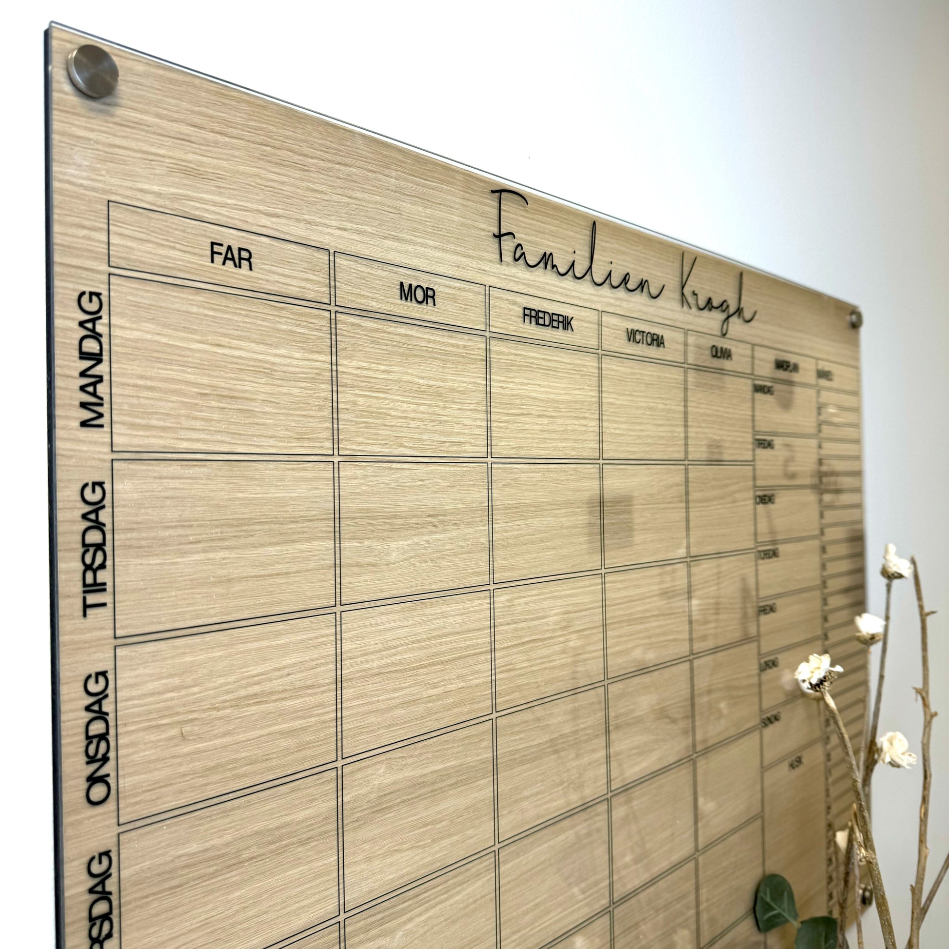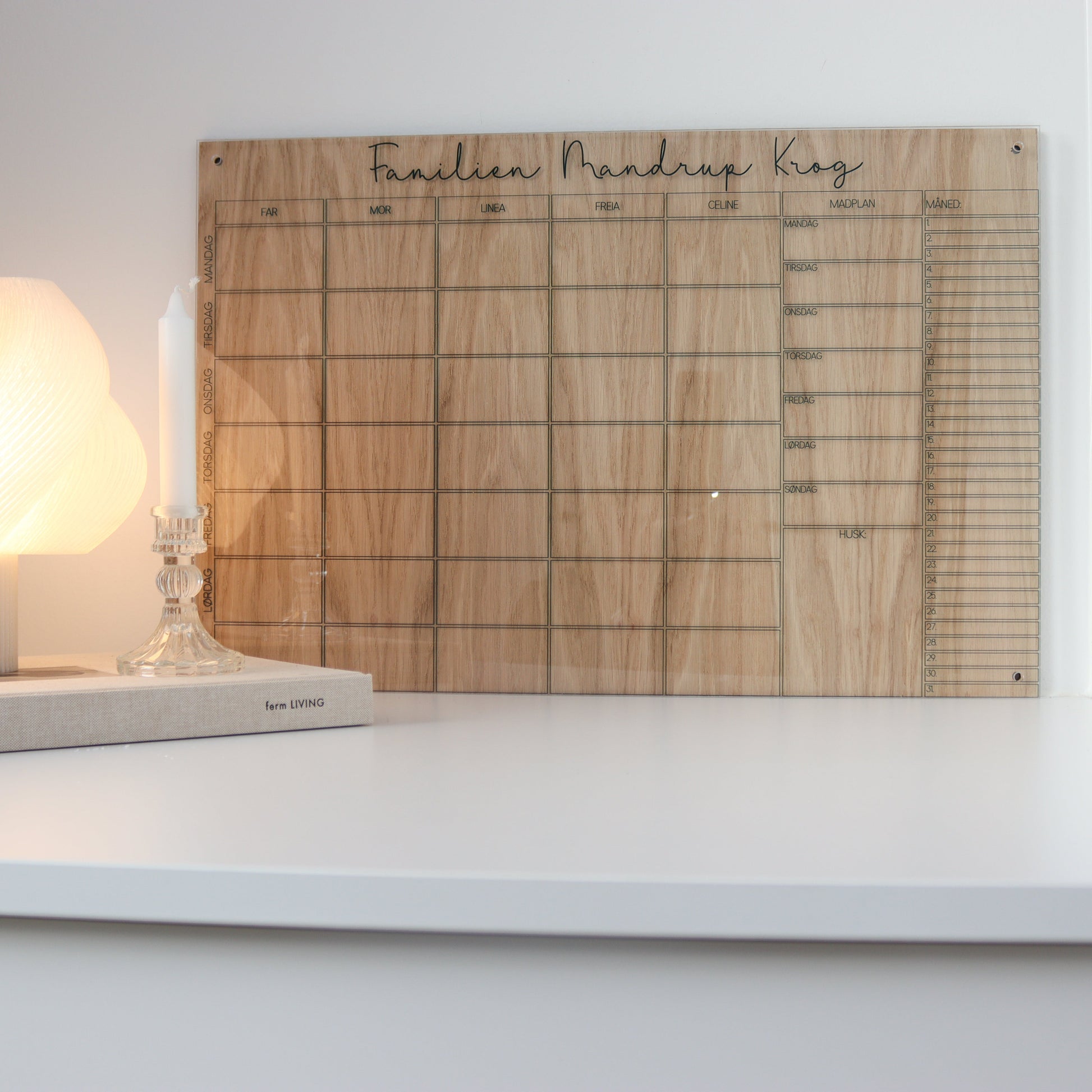 Vi introduserer vår familiekalender i eik – en elegant og praktisk måte å organisere familiens hektiske hverdag på. Denne stilfulle kalenderen kombinerer funksjonalitet og estetikk, med trykk på en gjennomsiktig akrylplate som bevarer det rene uttrykket, og en vakker bakside i eikefinér som tilfører varme og karakter.