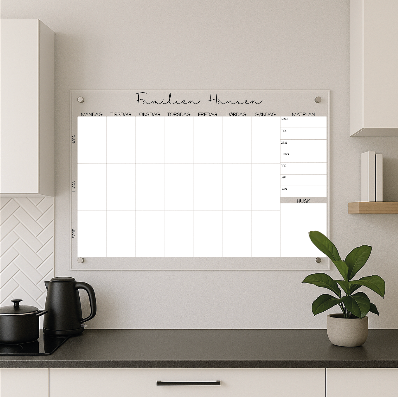 Ønsker du å sette et personlig preg på familiens planlegging og samtidig få en flott veggdekorasjon? Vår personlige familiekalender i plexiglass er den ultimate løsningen. Denne kalenderen er mer enn bare en tidsplan – den er skreddersydd for familiens unike behov og stil.