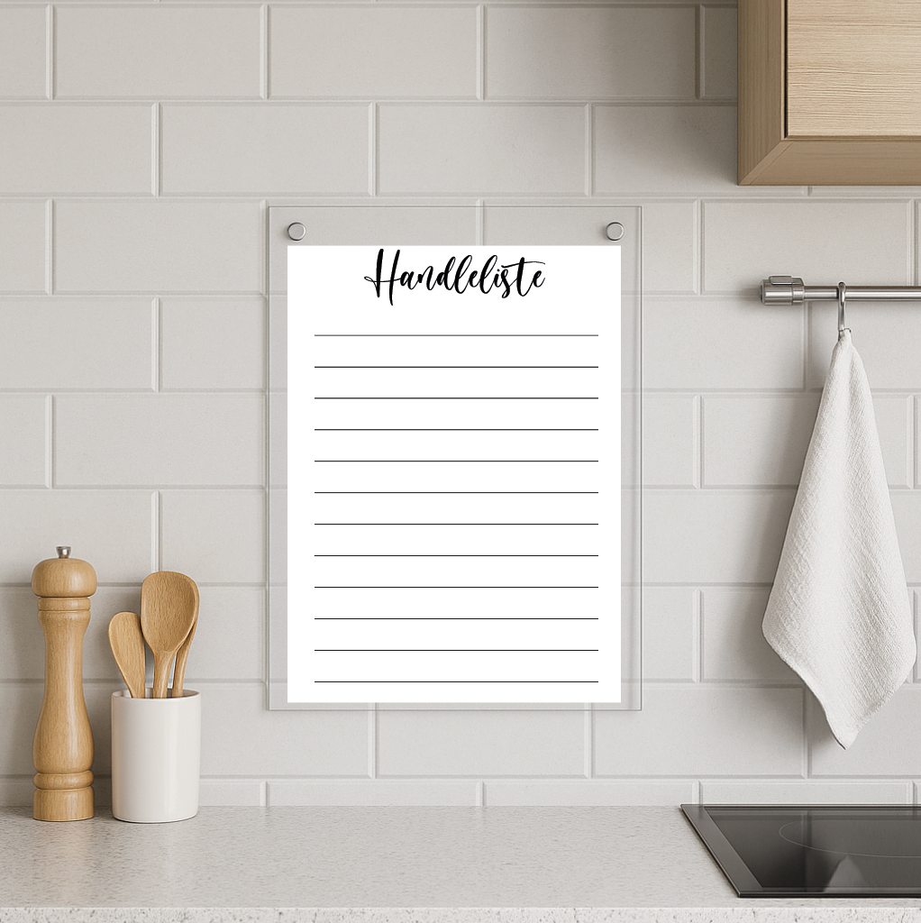 En handleliste som kan brukes igjen og igjen. Skriv med en whiteboardpenn, tørk enkelt av med en fuktig klut – så er den klar til neste gang du skal handle.