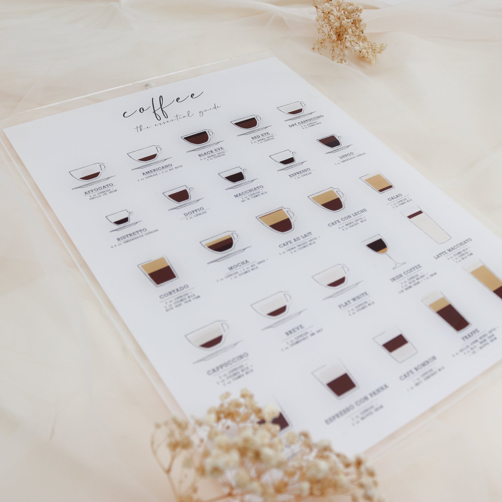 Vår kaffeguide i akryl er den ultimate følgesvennen for enhver kaffeelsker. Den er nøye utformet med ulike kaffeoppskrifter og leveres klar til oppheng med et praktisk hull øverst. Guiden kombinerer funksjon og estetikk – en perfekt måte å utforske og nyte ulike kaffesmaker på.