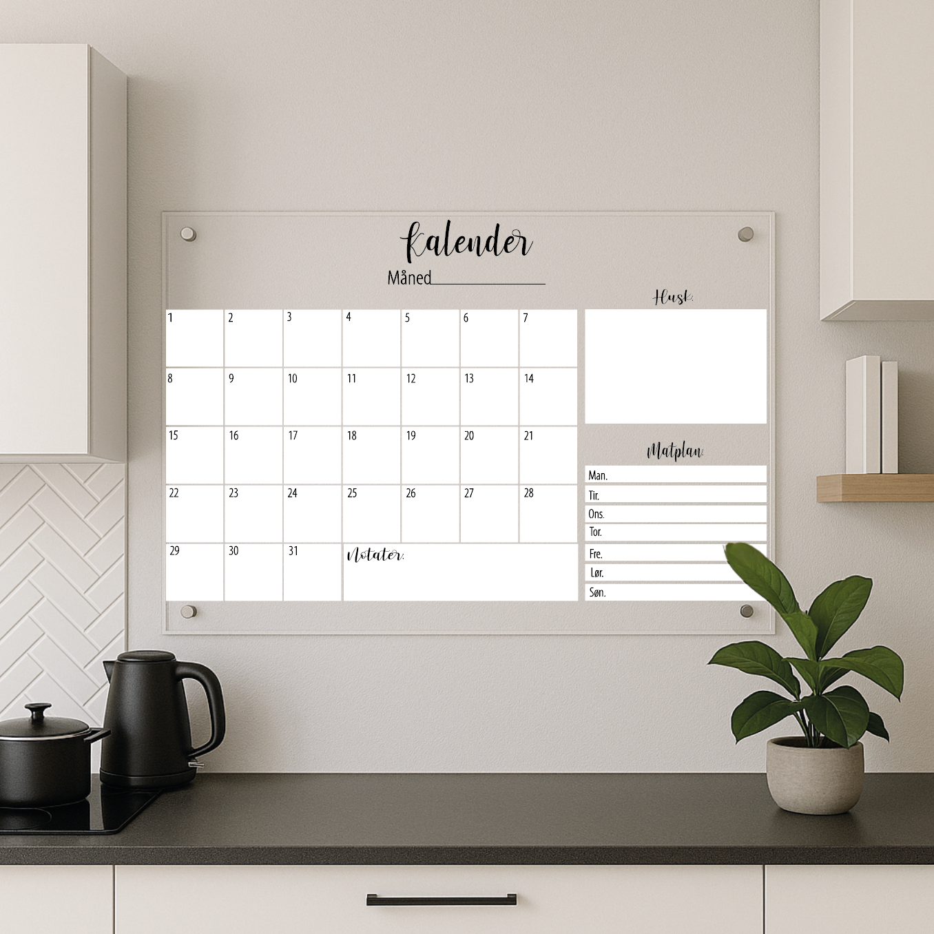 - Holdbar akryl: Kalenderen er laget av slitesterkt akryl som er lett å skrive på og enkelt å tørke av med en whiteboardtusj.