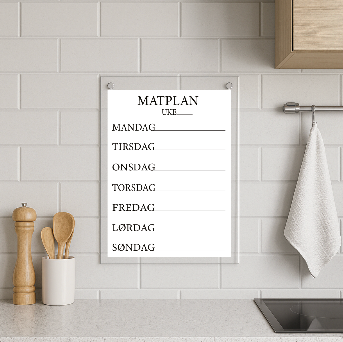 Den gir rask oversikt og er perfekt å ha hengende på kjøkkenet. Matplanleggingstavlen er enkel å endre på hvis planene skulle forandre seg, og er derfor et genialt hjelpemiddel for enhver familie.