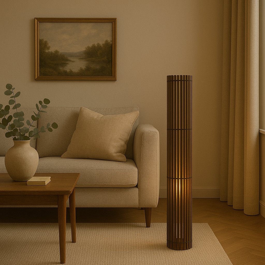 Den unike lampeskjermen består av vertikale eikelister som elegant omkranser lyskilden og skaper et stemningsfullt spill av lys og skygger i rommet.