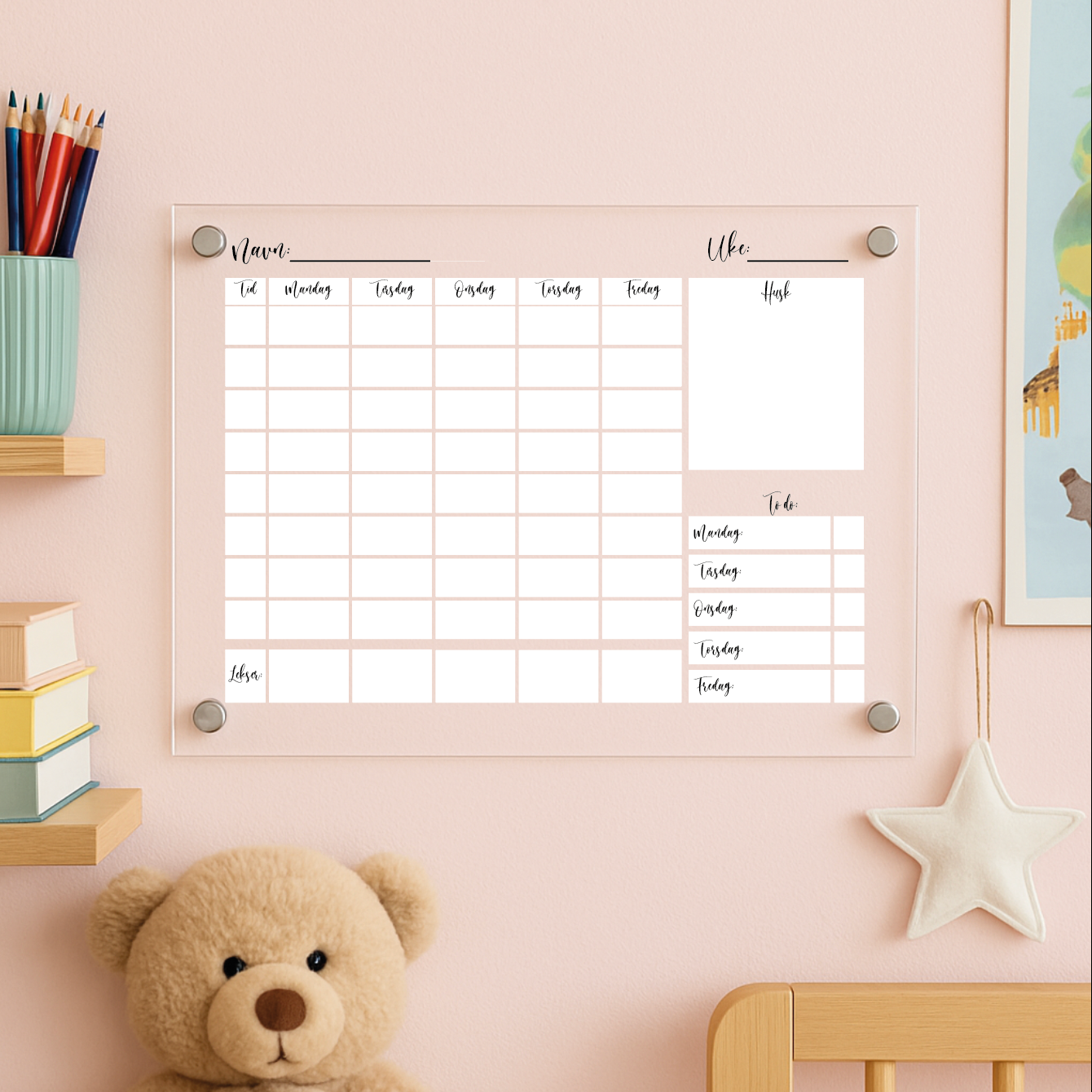 Timeplanen er laget i plexiglass og kan derfor brukes uke etter uke, i mange år.