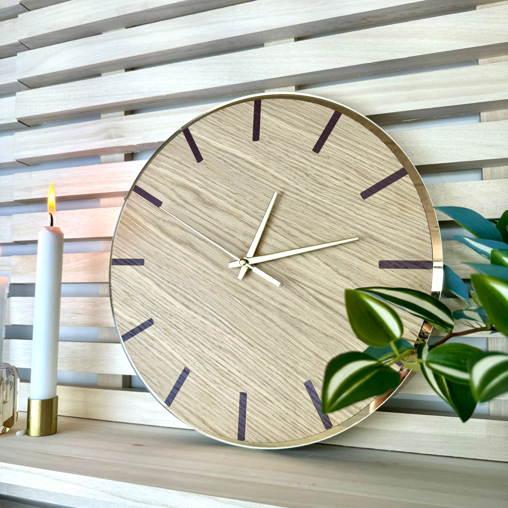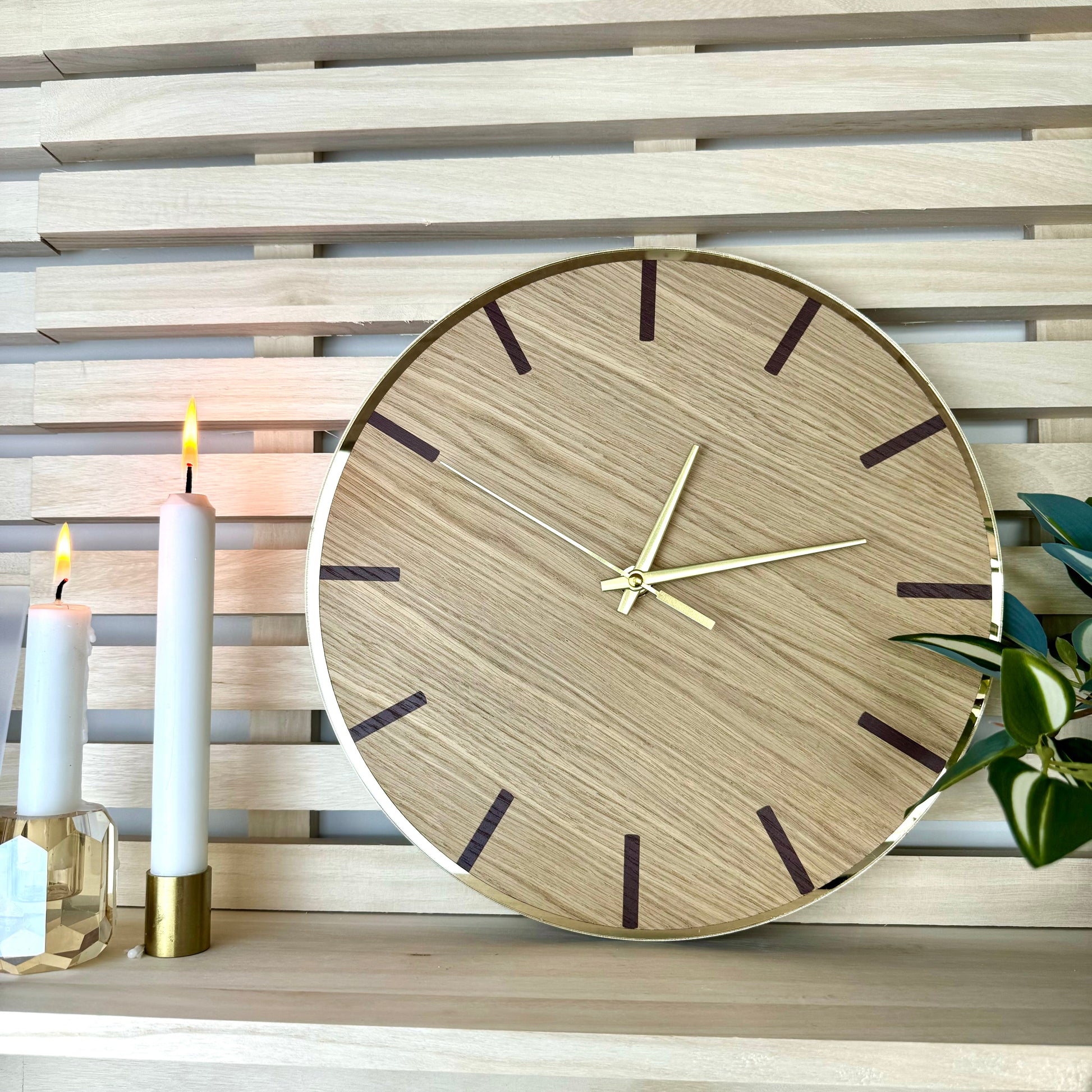 Dykk ned i en verden av tidløs eleganse med våre nye klokker i eik med bakplate i gullspeilakryl. Hver klokke er laget av vakker eik som utstråler varme og naturlig sjarm. Eikens unike mønster og tekstur tilfører en rustikk eleganse som gir hjemmet ditt et snev av naturinspirert stil. Klokkestrekene er trykt i en vakker brunfarge som gir et harmonisk og sofistikert uttrykk.