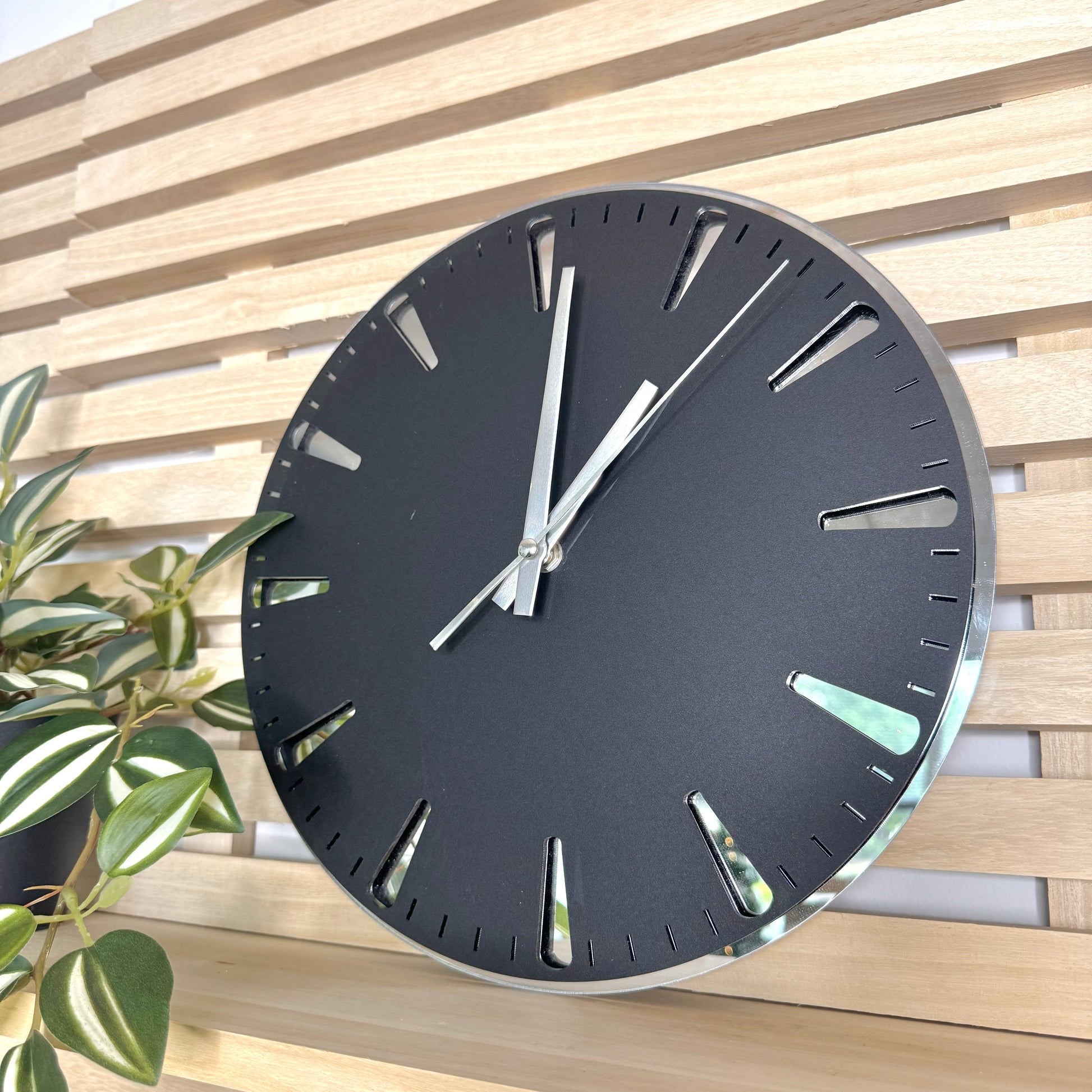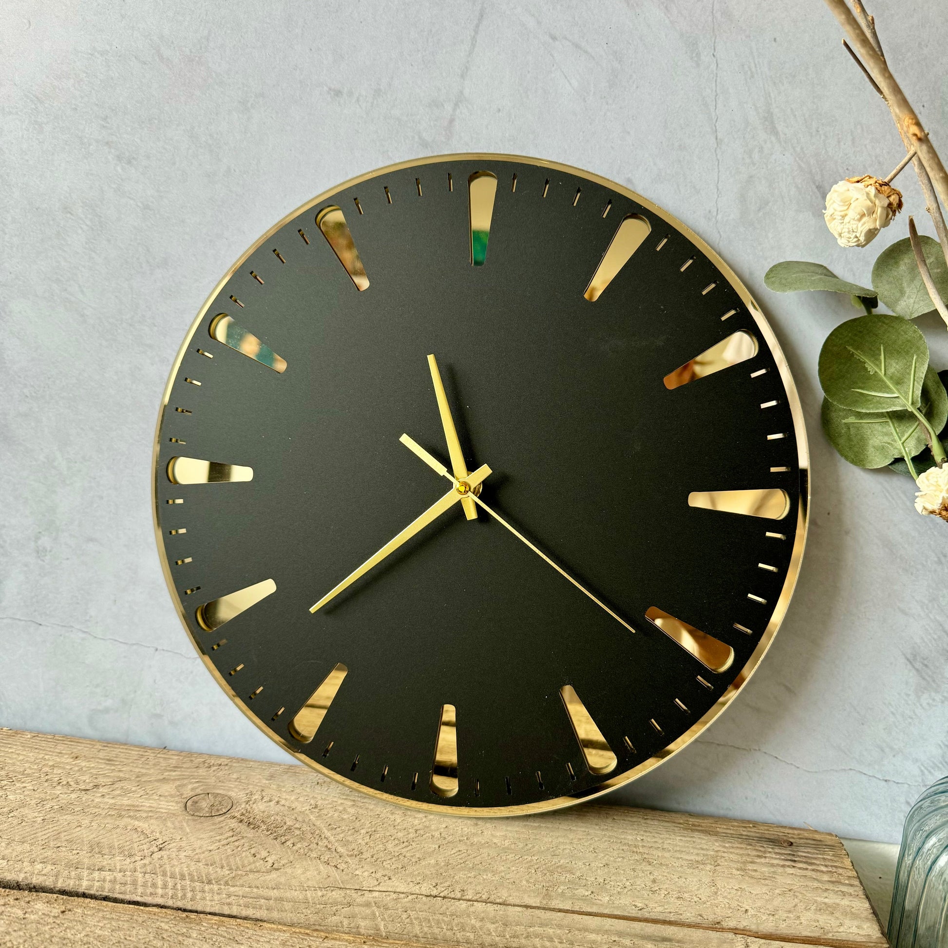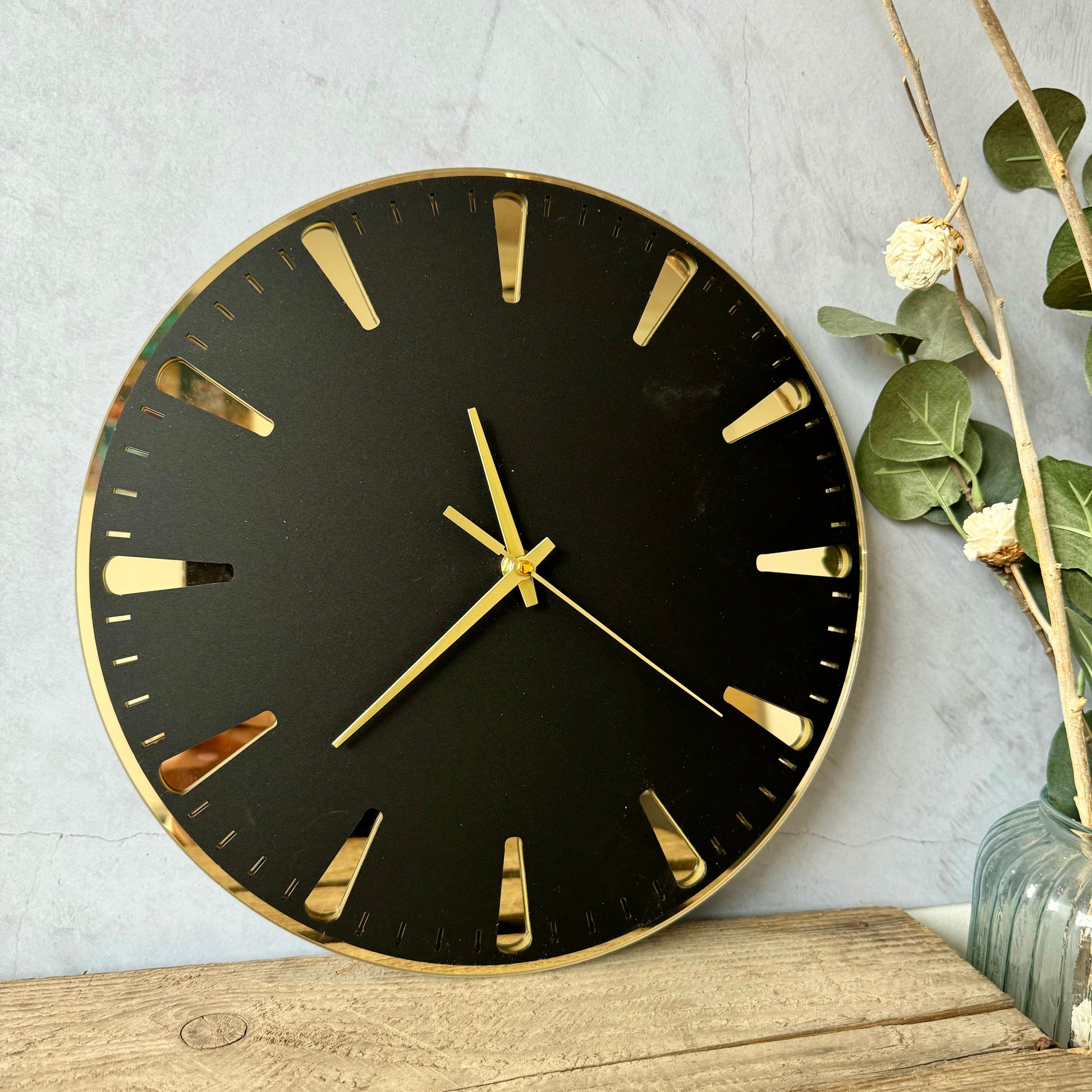 Dykk ned i en verden av tidløs eleganse med vår nye veggklokke i matt svart og gullfarget speilakryl – helt uten tikkelyder.