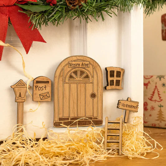 En søt og personlig nissedør med tilhørende postkasse, lyktestolpe, vindu, velkomstskilt og trapp!