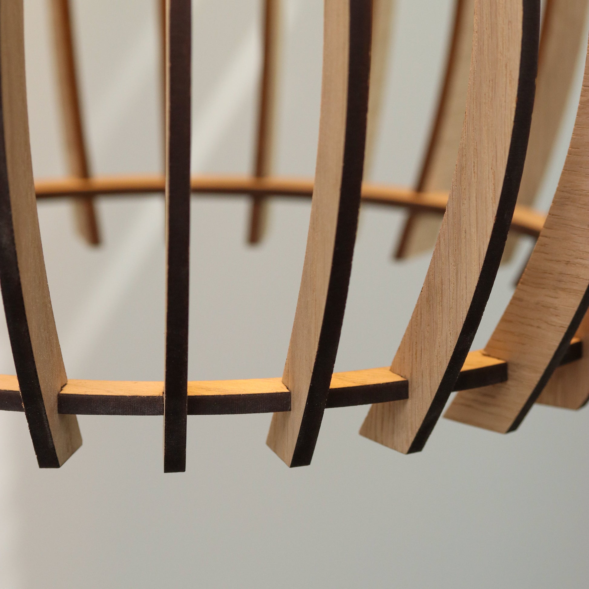 Lampen er laget av bærekraftig tre og passer inn i både moderne, nordisk og klassisk innredning. Den åpne konstruksjonen gir en lett og elegant følelse, samtidig som lyset fordeles jevnt i rommet. Ideell som spisebordslampe eller som dekorativ belysning i hjemmet.