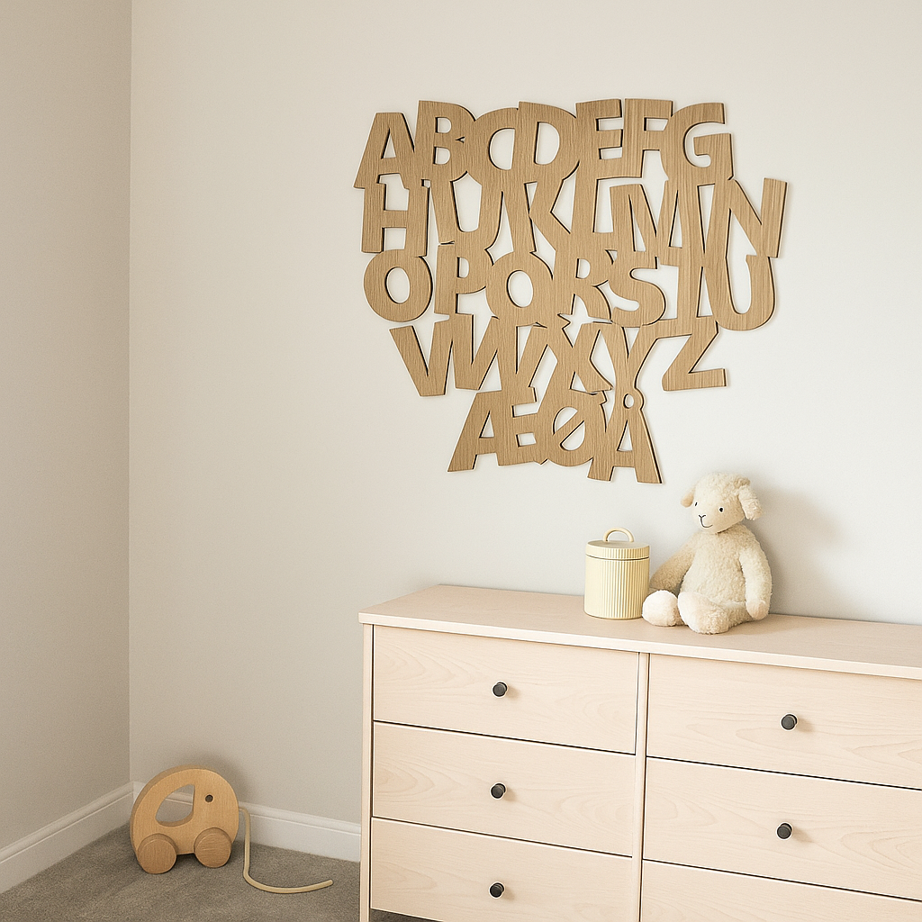 Materiale: Det sammenflettede alfabetet er laget av vakker eik, som gir både holdbarhet og en naturlig, tidløs finish. Den høye materialkvaliteten sørger for at dekorasjonen holder seg like flott i mange år.