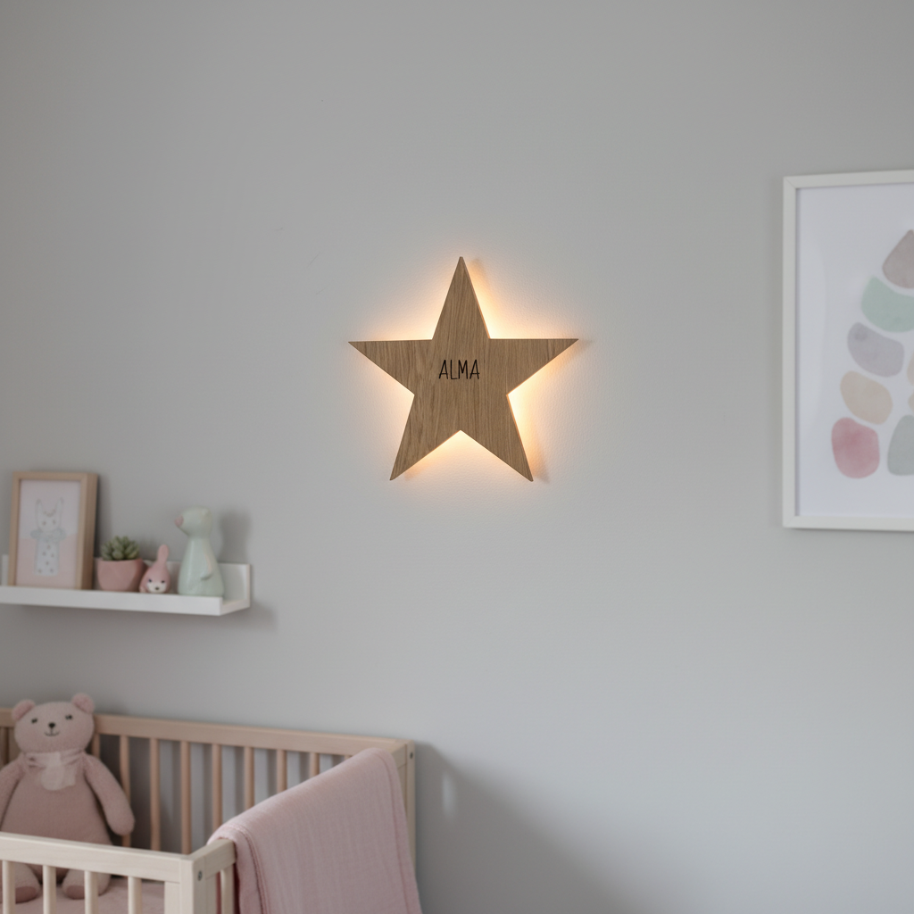 Skap en rolig og trygg atmosfære på barnerommet med vår barnelampe i vakker eik, designet med fokus på både estetikk, funksjonalitet og personlighet.