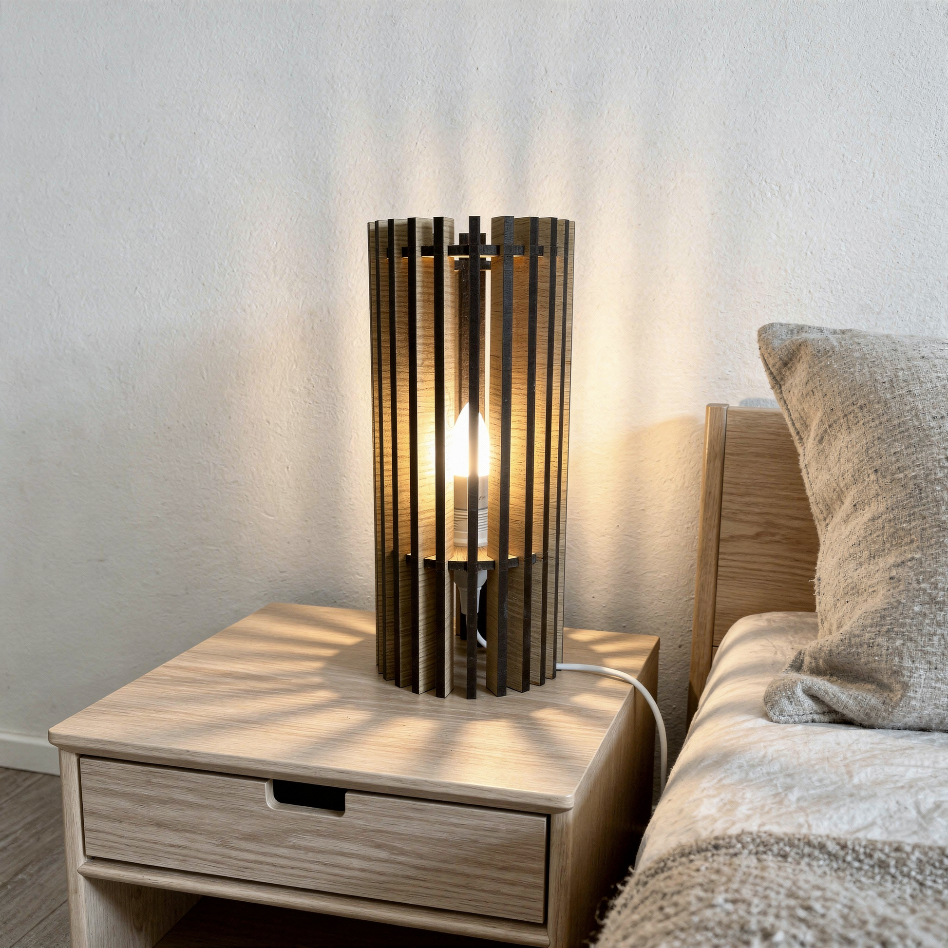 Den unike lampeskjermen består av vertikale eikelister som elegant omslutter lyskilden og skaper et stemningsfullt spill av lys og skygger i rommet.