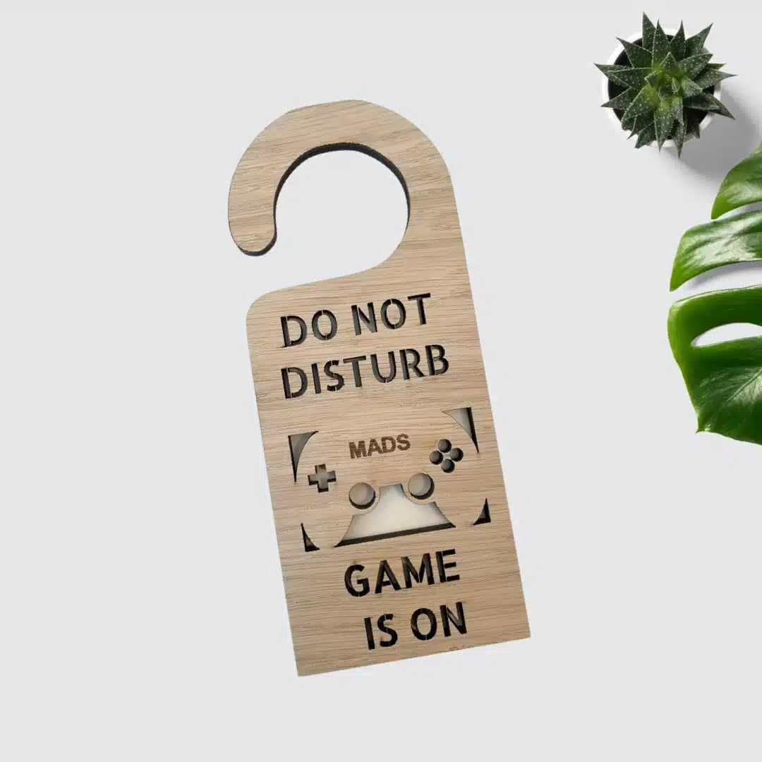Har du en liten "gamer" hjemme? Da er vårt sjarmerende dørskilt i vakkert eiketre den perfekte måten å la alle vite at barnet spiller og ønsker litt uforstyrret tid.