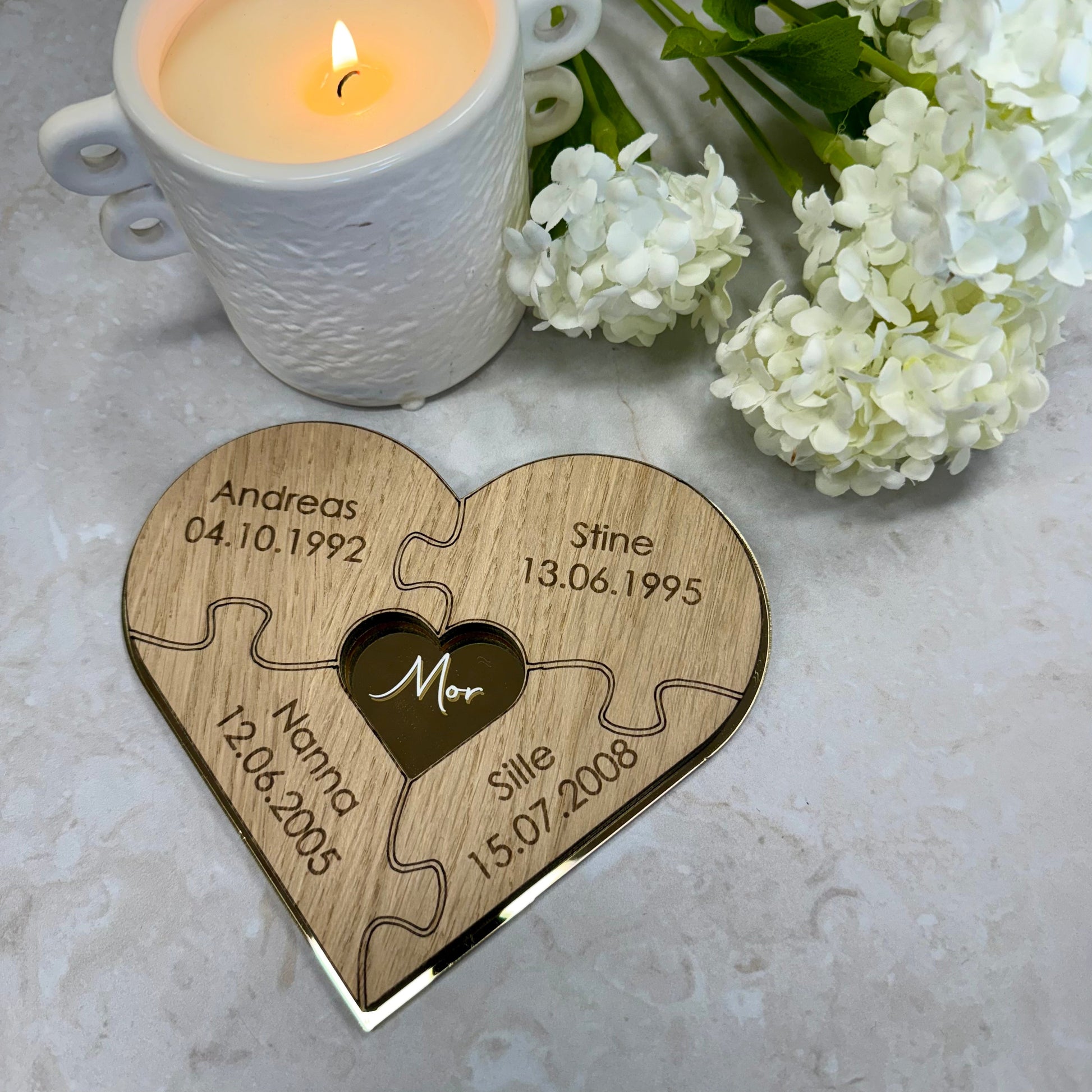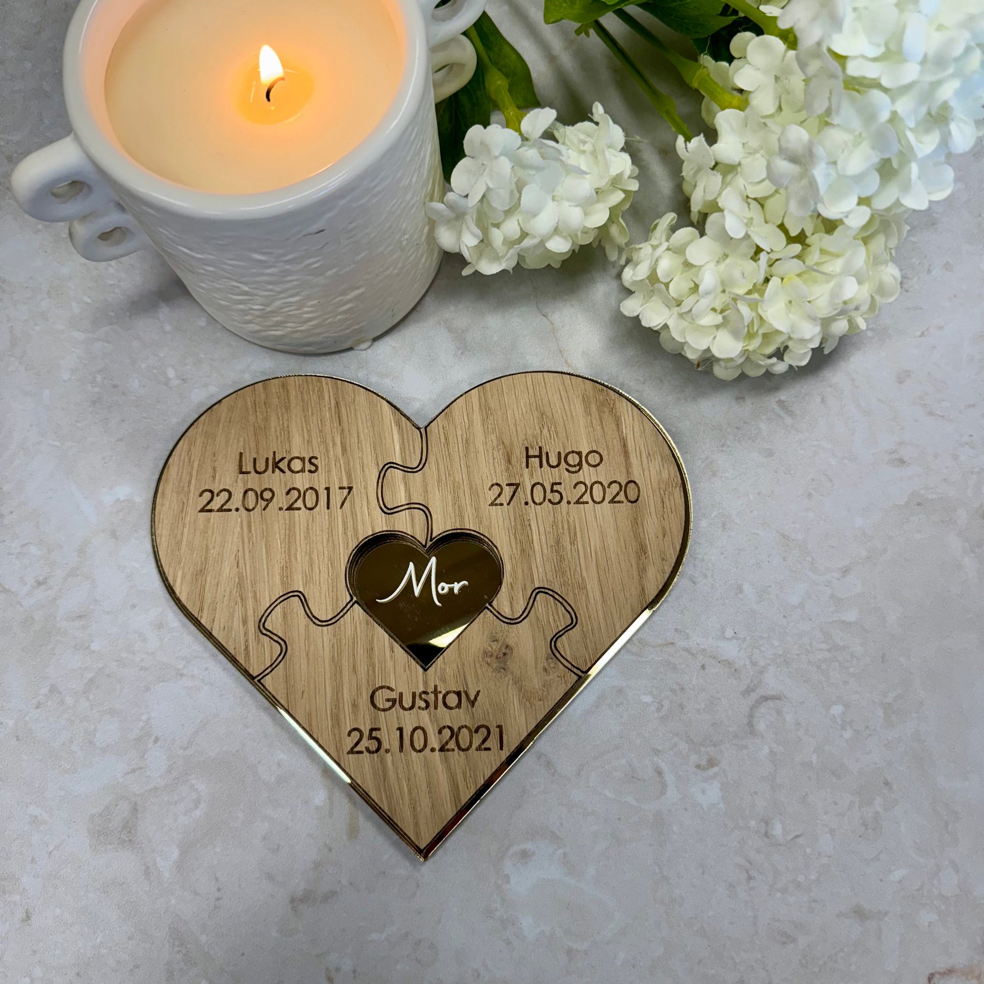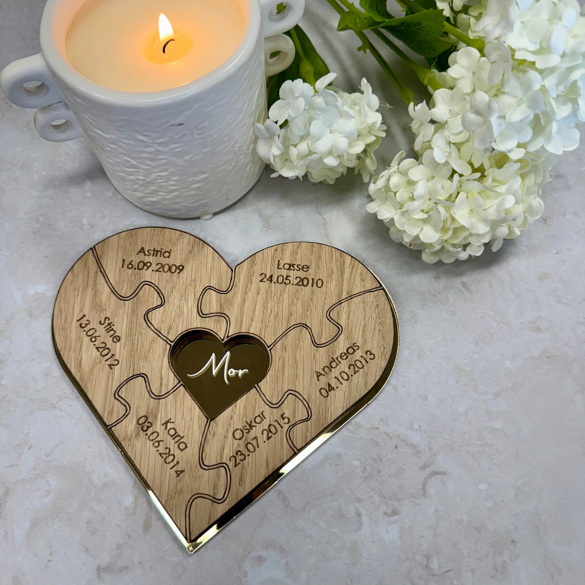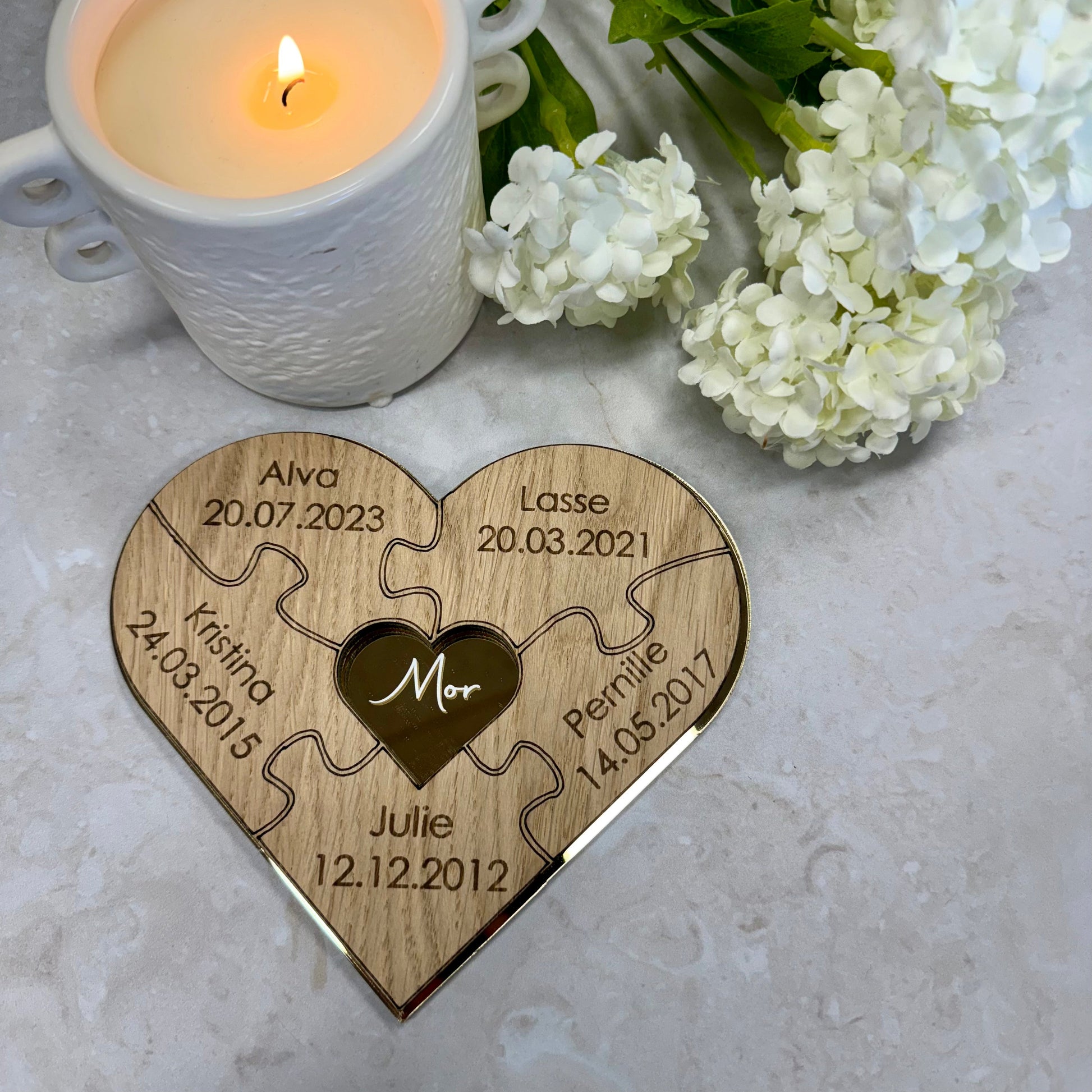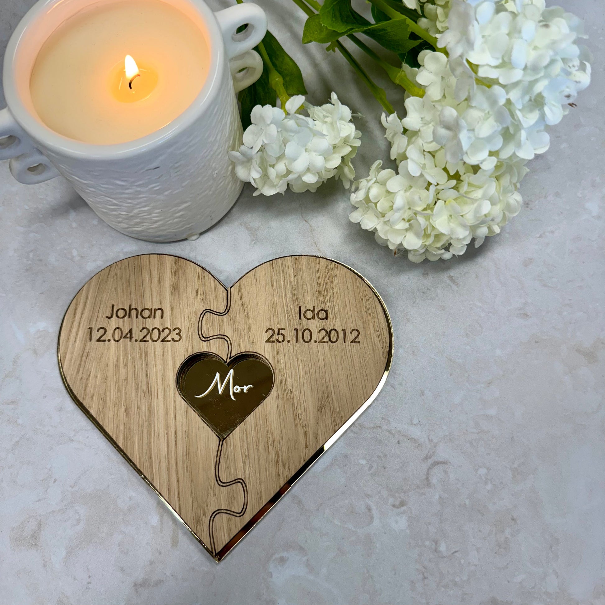 Gi moren din en gave som forteller en personlig historie – full av kjærlighet, tilknytning og takknemlighet. Vårt hjerteformede puslespill i gullakryl og eik er en unik kombinasjon av eleganse og varme, perfekt for å feire det spesielle båndet mellom mor og barn.
