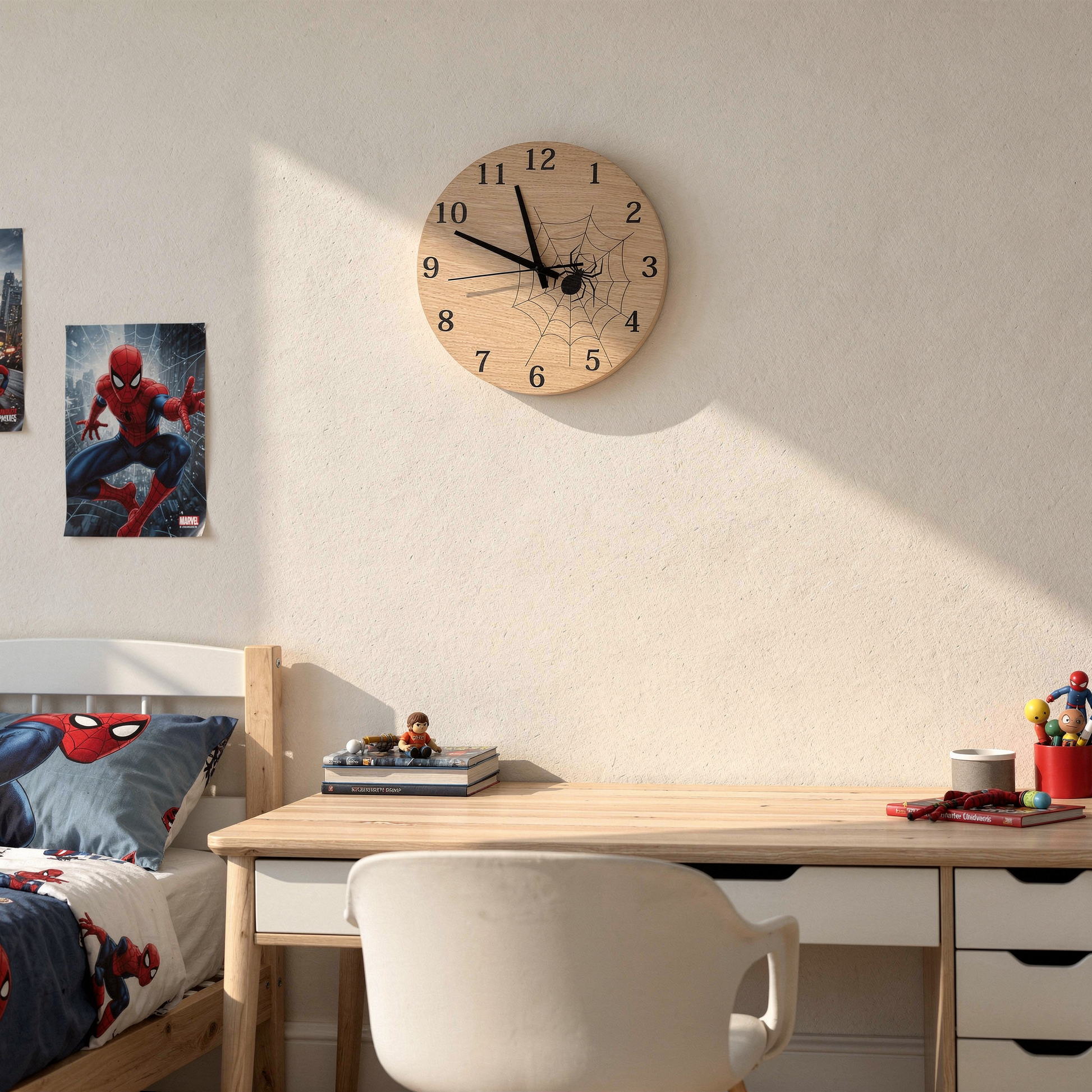 Dette vegguret kombinerer naturens skjønnhet med et lekent motiv som barn elsker. Det unike designet gir rommet et personlig preg, samtidig som det understøtter en naturlig og stilren innredning.