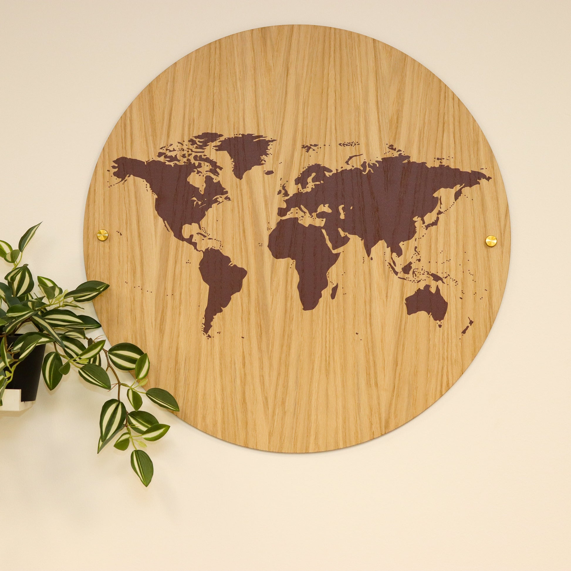 Opplev verden hjemmefra med dette vakre verdenskartet trykt i brunt på en elegant, rund eikeplate.